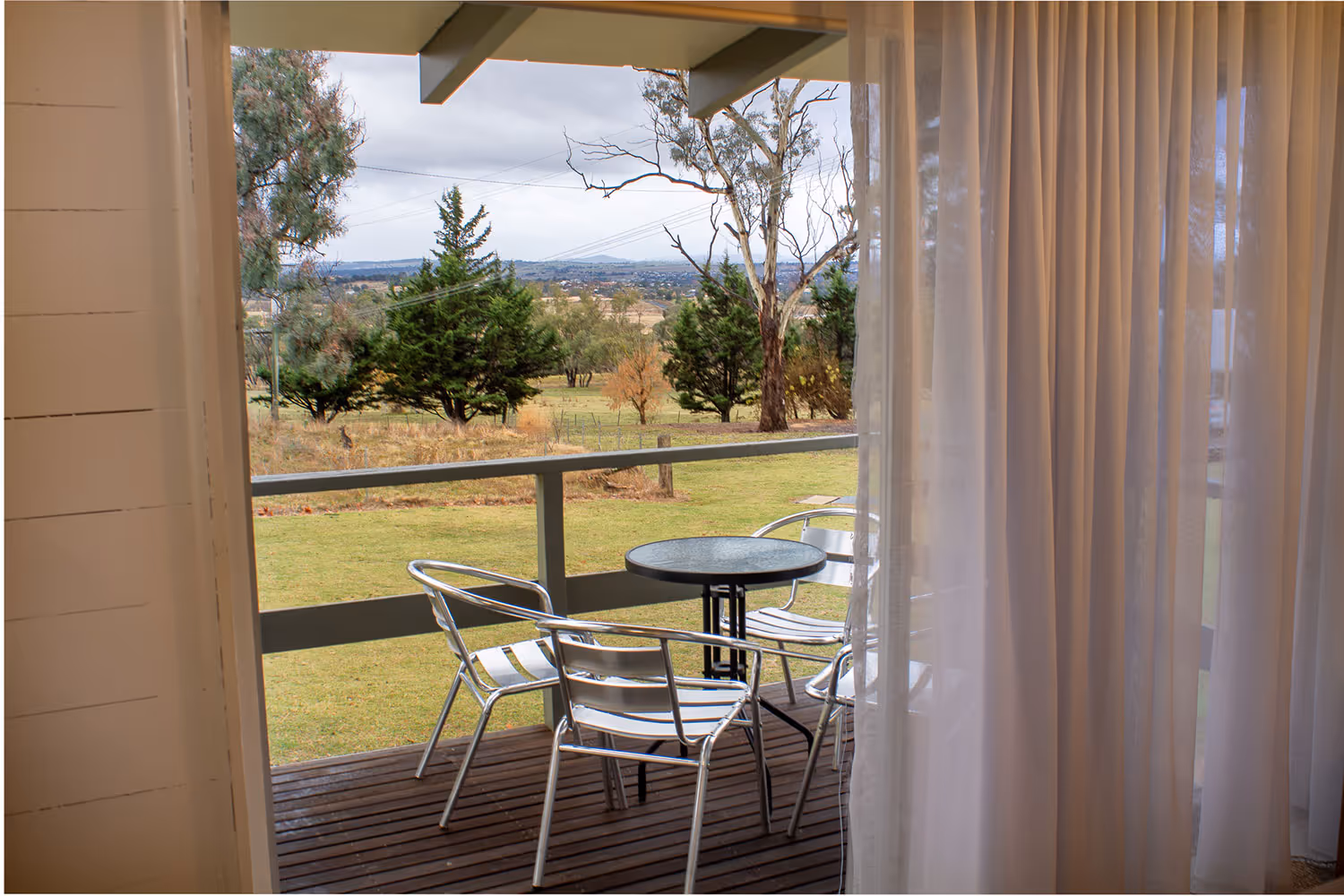 Each cabin has a king bed plus a bunk with two singles, accommodating up to four guests. Inside you’ll find a kitchen with cooking utensils, a dining table, an ensuite, and everything you need to cook and relax. Step outside to your own private balcony and take in beautiful views over Bathurst and beyond.